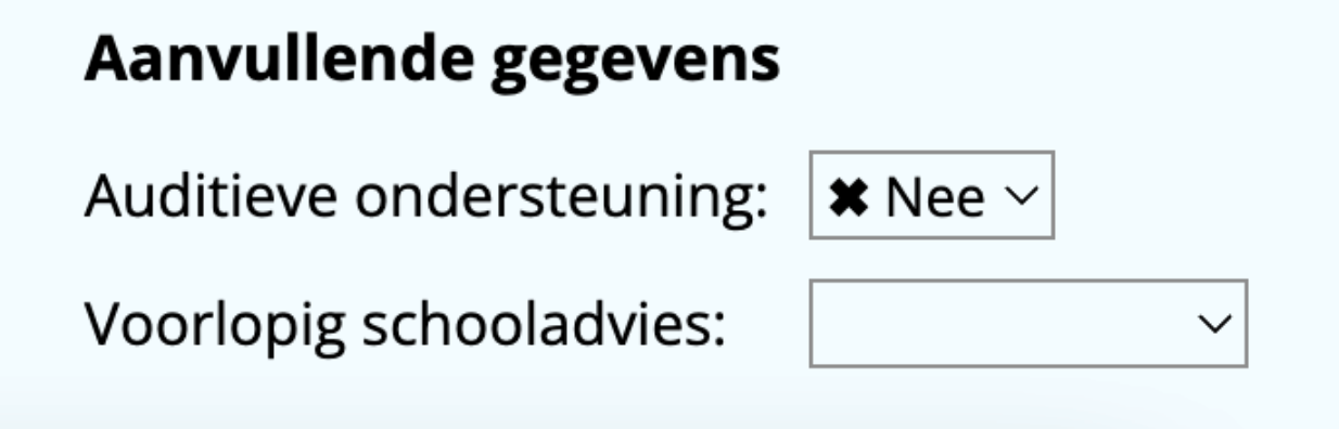 Vul de aanvullende gegevens in. Wanneer je nog geen voorlopig schooladvies hebt bepaald, kun je dit open laten.