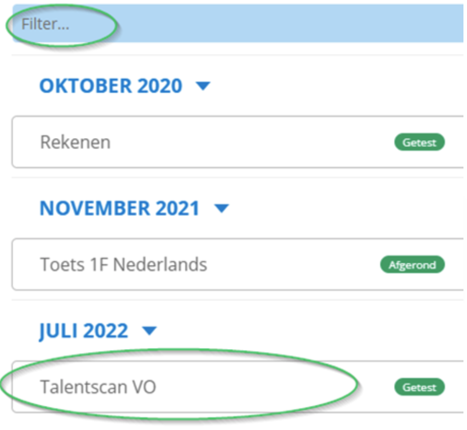 Wanneer er veel testen of opdrachten zijn, kun je zoeken via het veld ‘Filter…’