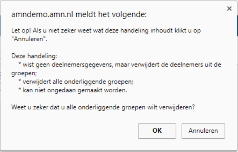 Binnen AMN kun je één map met groepen of alle groepen tegelijk verwijderen via Groepenbeheer. Let op: dit kan niet ongedaan worden gemaakt. Zodra groepen zijn verwijderd, zijn deelnemers moeilijker terug te vinden omdat ze niet meer aan een groep gekoppeld zijn.