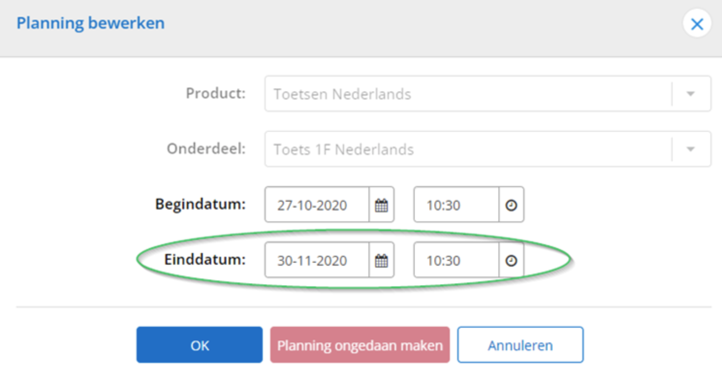 Controleer altijd goed of je de juiste toets of opdracht hebt geselecteerd voordat je de einddatum aanpast