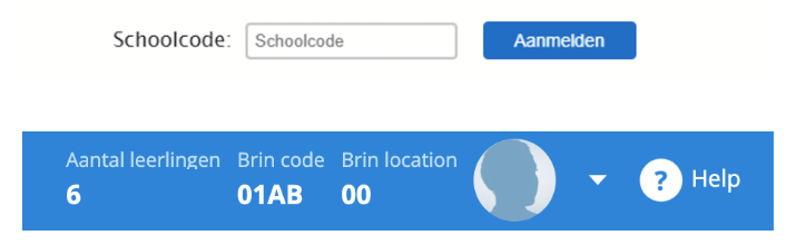 De schoolcode is de combinatie van het BRIN-nummer + locatienummer (bijv. 01AB00).